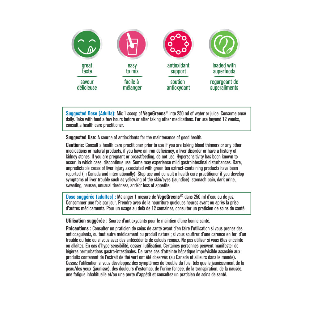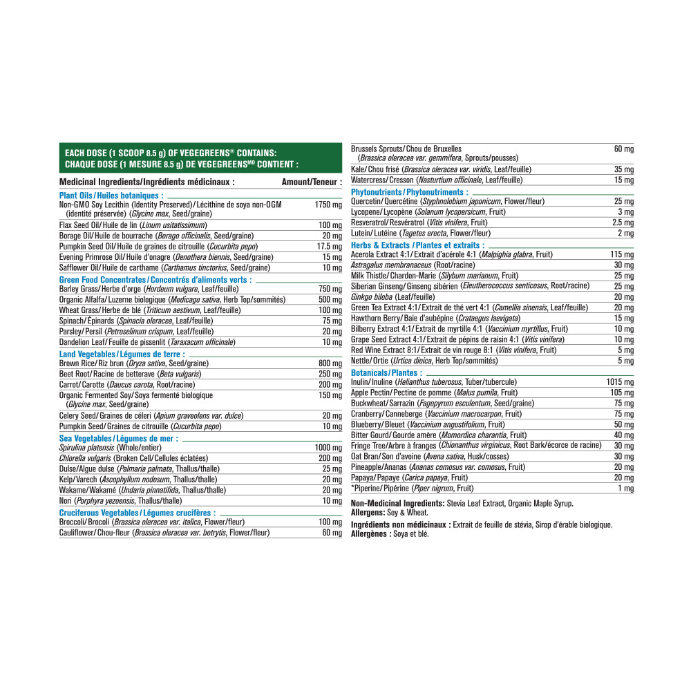 The Ultimate Super Food, VegeGreens is a comprehensive combination of over 60 land, sea and cruciferous vegetables, as well as super green foods, plant oils, phytonutrients, herbs & extracts and botanicals. With 8 distinctive blends of green foods and plant extracts, VegeGreens supplies an extraordinary spectrum of nutrients ranging from the rare trace minerals found in sea vegetables to the health-enhancing compounds exclusive to cruciferous vegetables. Each small scoop provides the nutrient equivalent of 6 to 8 servings of fresh vegetables.