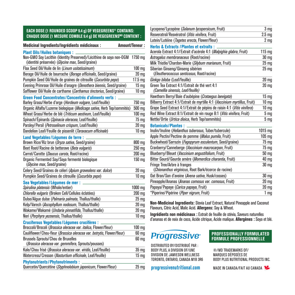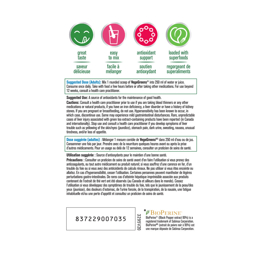 The Ultimate Super Food, VegeGreens is a comprehensive combination of over 60 land, sea and cruciferous vegetables, as well as super green foods, plant oils, phytonutrients, herbs & extracts and botanicals. With 8 distinctive blends of green foods and plant extracts, VegeGreens supplies an extraordinary spectrum of nutrients ranging from the rare trace minerals found in sea vegetables to the health-enhancing compounds exclusive to cruciferous vegetables. Each small scoop provides the nutrient equivalent of 6 to 8 servings of fresh vegetables.