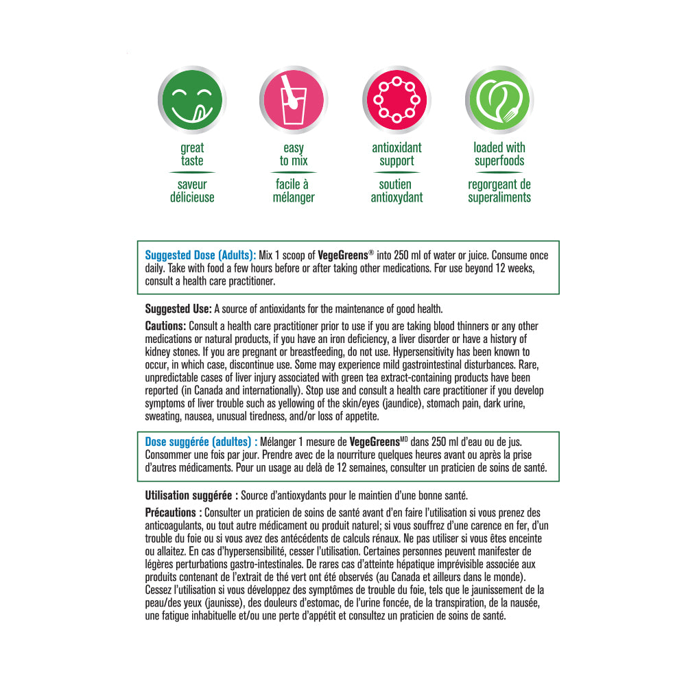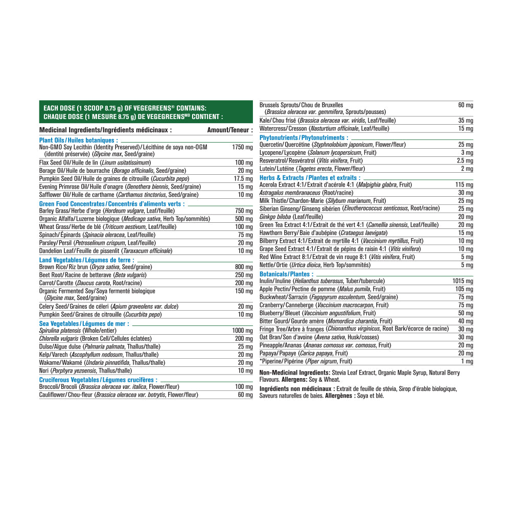 The Ultimate Super Food, VegeGreens is a comprehensive combination of over 60 land, sea and cruciferous vegetables, as well as super green foods, plant oils, phytonutrients, herbs & extracts and botanicals. With 8 distinctive blends of green foods and plant extracts, VegeGreens supplies an extraordinary spectrum of nutrients ranging from the rare trace minerals found in sea vegetables to the health-enhancing compounds exclusive to cruciferous vegetables. Each small scoop provides the nutrient equivalent of 6 to 8 servings of fresh vegetables.