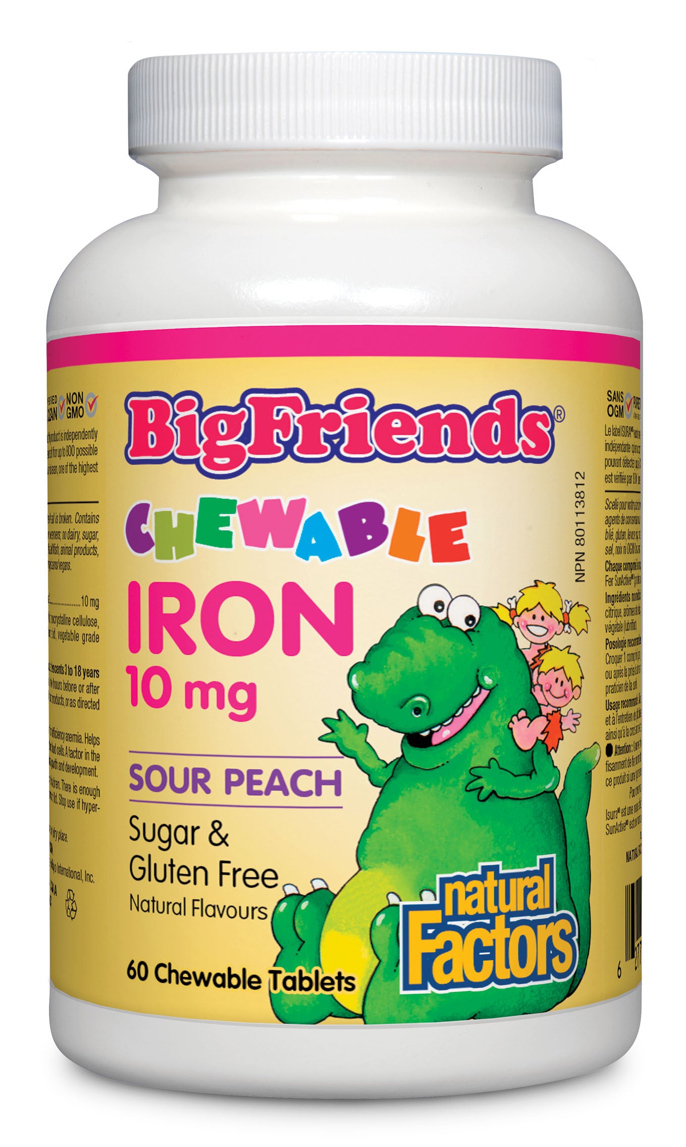 Natural Factors Big Friends Chewable Iron 10 mg is a fun and delicious way for children to fulfill their iron requirements. Iron is a factor in the formation and proper function of red blood cells. When children do not consume enough iron through their diet, supplementation can help prevent iron-deficiency anemia and associated tiredness and fatigue. Children ages three and up will love the chewable sour-peach-flavoured tablets that are easily absorbed and gentle on the stomach.