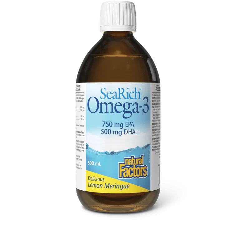 Natural Factors SeaRich Omega-3 is a great-tasting omega-3 formula made using the freshest, highest quality fish oil, to support cognitive and cardiovascular health. Each teaspoon provides 750 mg of eicosapentaenoic acid (EPA) and 500 mg of docosahexaenoic acid (DHA) in triglyceride form that offers higher bioavailability and ensures no fishy repeat or odour.